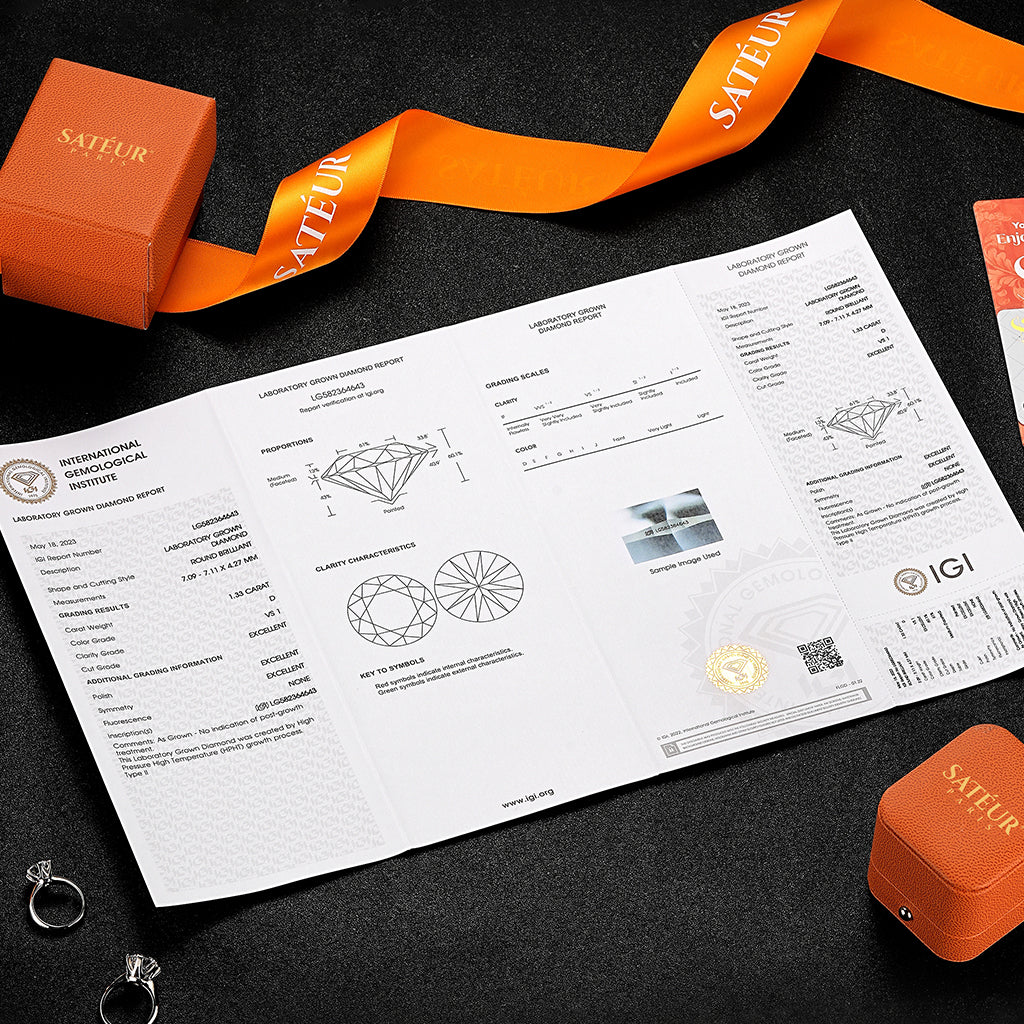 كل ماسة مختبر Satéur تأتي مع شهادة IGI—تثبت أصالتها، وقصها، ووضوحها (VS+)، وتصنيف اللون D–F.